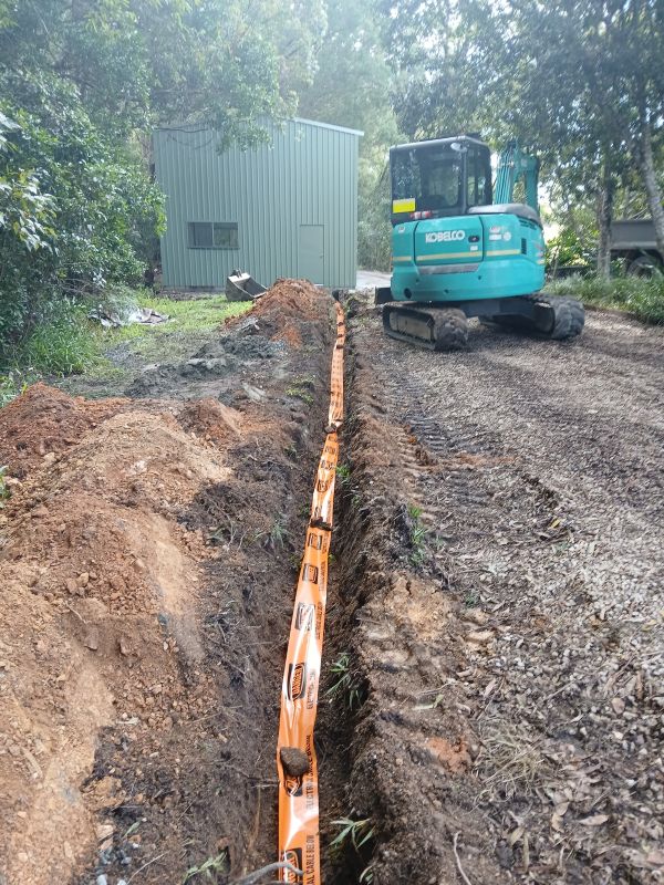 Running underground sub-mains involves the installation of mechanically protected cabling through conduit, which must be trenched at the correct depth and backfilled appropriately. On rural properties, this often necessitates collaboration with an earthworks contractor for the trenching process. The electrical connections at both ends, including those at the main switchboard and the shed sub-board, must be executed by licensed electrical professionals. We manage the entire process, overseeing earthworks, so you only need to communicate with one point of contact instead of juggling multiple trades, making the project more streamlined and efficient for our clients.